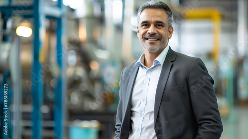 Portrait of a factory owner or manager in a business suit background warehouse. Banner industrial plant process
