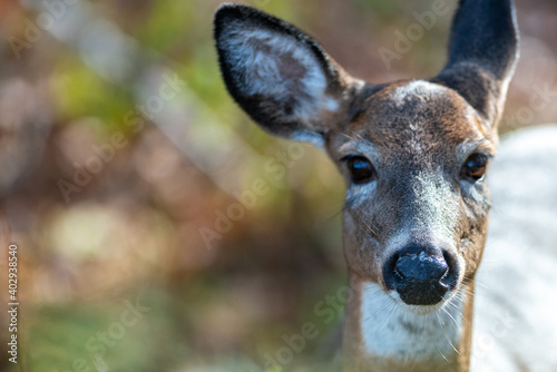 Portrait of a female deer stands attentively staring. The animal has a brown body with white on its chin and belly. The wild deer have large pointy ears, dark nose, and eyes with autumn foliage.