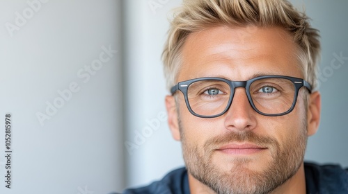 Portrait of a focused and thoughtful man wearing stylish glasses and a casual shirt, posed against a simple white background, exuding calm efficiency and clarity.
