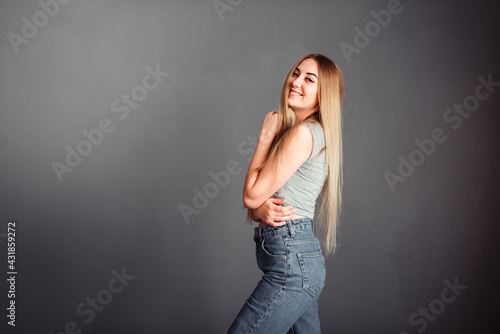 Portrait of a girl who stands sideways and fists her cheek on a gray background without retouching.