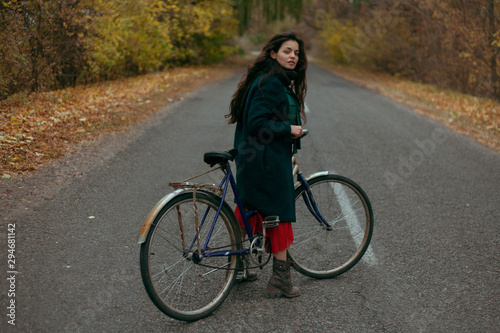 portrait, pavement, overcoat, outdoors, nature, move, motion, machine, lifestyle, life, leisure, gravel, fall, bicyclist, coat, dirt road, clothing, bike, woman, bicycle, wheel, autumn, way, asphalt, vehicle, apparel, travel, transportation, sleepy, tire, tarmac, street, spoke, smile, sleeve, road, recreation, caucasian, white, girl, female, person, people, adult, adult, 20s, young adult, young adult, young person, grown-up
