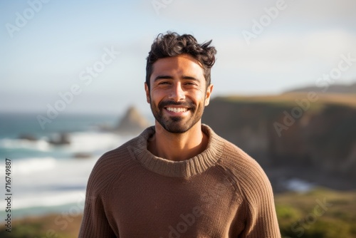 Portrait of a grinning indian man in his 20s wearing a classic turtleneck sweater against a serene seaside background. AI Generation