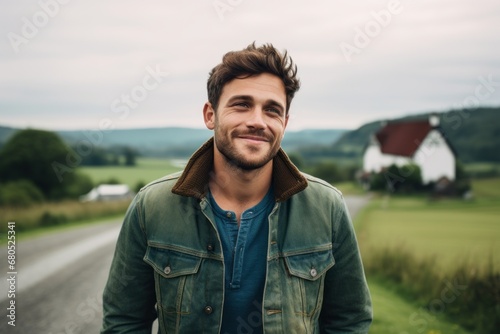 Portrait of a grinning man in his 20s sporting a rugged denim jacket against a quiet countryside landscape. AI Generation