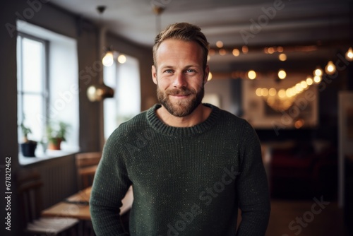 Portrait of a grinning man in his 30s dressed in a warm wool sweater against a scandinavian-style interior background. AI Generation