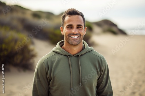 Portrait of a grinning man in his 40s dressed in a comfy fleece pullover against a sandy beach background. AI Generation