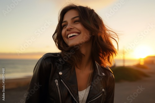 Portrait of a grinning woman in her 20s sporting a stylish leather blazer while standing against vibrant sunset horizon