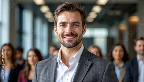 Portrait of a handsome business leader. Confident businessman standing in a modern office with colleagues in the background.
