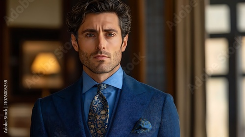 man, portrait, photogenic, suit, blue, attaching, floral, fashion, style, formal, confident, serious, professional, elegant, posh, groom, gentleman, business, model, clothing, wear, dress, photo, studio, background, light, shadow, texture, pattern, detail, closeup, face, eye, hair, beard, moustache, shirt, pocket, handkerchief, accessory