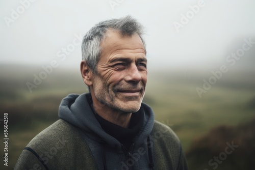 Portrait of a handsome middle-aged man with gray hair, wearing a grey hoodie, standing in a misty field.