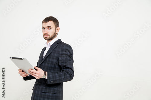 Portrait of a handsome young bearded man wearing a formal black suit holding a tablet