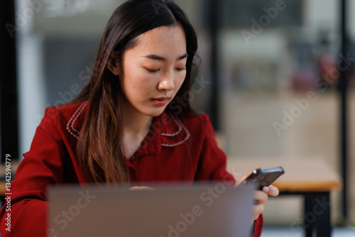 Portrait of a happy Asian businesswoman using phone and work on laptop, Asian businesswoman working in modern office.