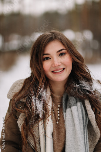 Portrait of a happy cheerful emotional woman with curly hair in warm clothes having fun laughing walking alone among the trees in the forest in winter on vacation, selective focus
