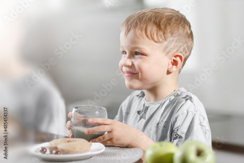 Portrait of a happy child during breakfast in the kitchen. Children's healthy and tasty breakfast.