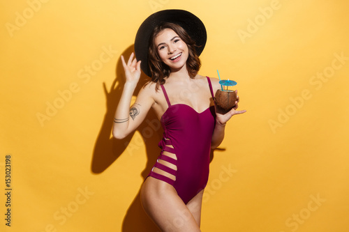 portrait, female, pretty, summer, isolated, woman, beautiful, young, swimwear, cocktail, happy, girl, modern, drink, lifestyle, beverage, sexy, alcohol, swimwear, background, caucasian, beach, cheerful, adorable, positive, hold, cute, joyful, adult, glasses, straw, tropical, fun, attractive, smile, person, standing, holding, fruit, summer, seasonal, holiday, relax, fresh, yellow, tattoo, coconut, greeting, waving, hand