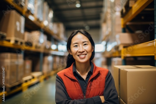 portrait, joyful, middle-aged, asian, female, warehouse, men at work, people, smiling, woman, employee, industry, occupation, job, professional, work, logistic, adult, labor, career, business, uniform, safety, active, energy, motivation, sharpened, productivity, skill, industrial, happy, emotion, workplace, equipment, dedication, task, efficiency, modern, one person, lifestyle