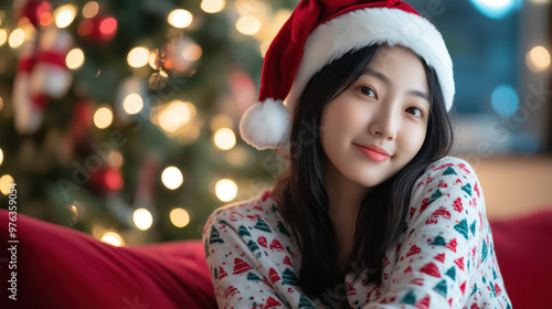 christmas, korean, woman, santa, sweater, portrait, festive, holiday, cheerful, decorated, tree, young, celebration, winter