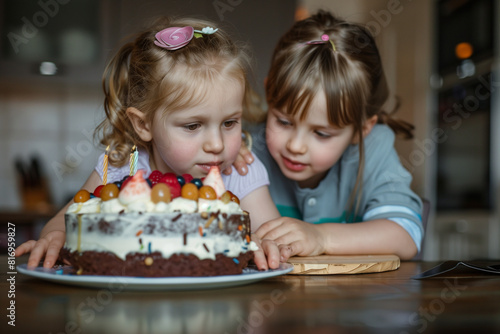 Portrait of a little cheerful birthday girl with the cake. Seeing the cake. Smash cake