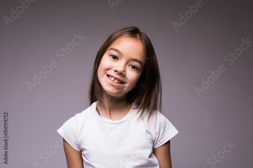 Portrait of a little girl with a smiling expression isolated on gray background