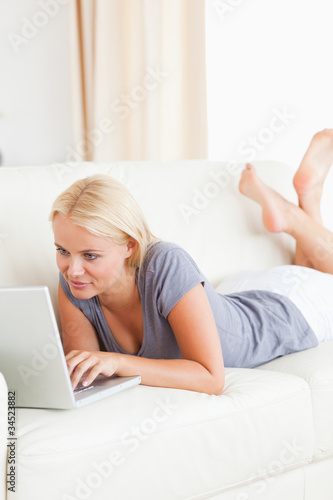one person, attractive, woman, gorgeous, blond, beautiful, computer, laptop, lifestyle, smiling, missy, caucasian appearance, blond, background, beauty, calm, casual attire, close, colours, communication, couch, cute, hair, hand, happy, head, home, hot, house, indoor, cyberspace, isolated, lap, leisure, life, living, look, lying, modern, natural, pretty, room, smile, sofa, technology, up, wall, white, work