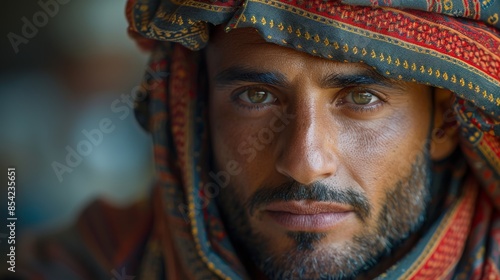 Portrait of a man with captivating eyes wearing a colorful traditional headscarf
