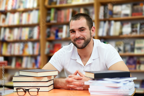 studying, photogenic, goggles, attractive, bookshop, row, boy, study, classroom, male, people, shelf, caucasian, smiling, portrait, bookshelf, learn, modern, youth, young, library, standing, science, bookshop, white, person, student, university, store, education, cognition, indoor, college, man, campus, book, happy, reading, high school