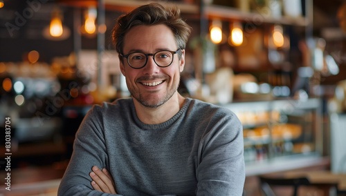 Portrait of a man with glasses smiling while in a cafe