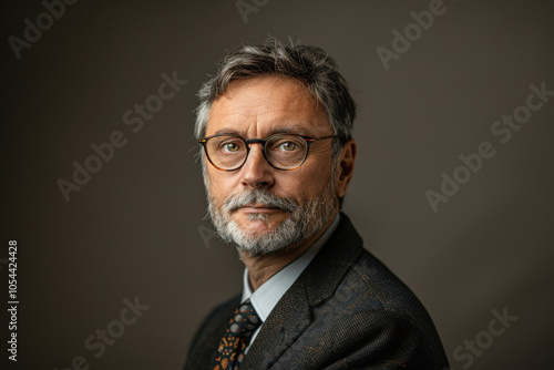Portrait of a Mature Gentleman in Glasses Description: This is a close-up portrait of a mature man with glasses, showcasing an introspective gaze and a neatly groomed beard. The neutral background hig