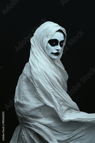 Portrait of a Middle Eastern woman with ghostly white face paint and dark hollow eyes, wearing a flowing white dress, copy space in the middle, in a black background, Halloween theme, haunting