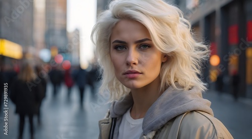 portrait of a modern woman with platinum blonde hair on the street of a big city