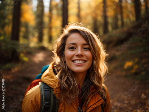 portrait of a nice hiker woman looking and smiling, wearing a backpack, at a forest in autumn season. AI generated