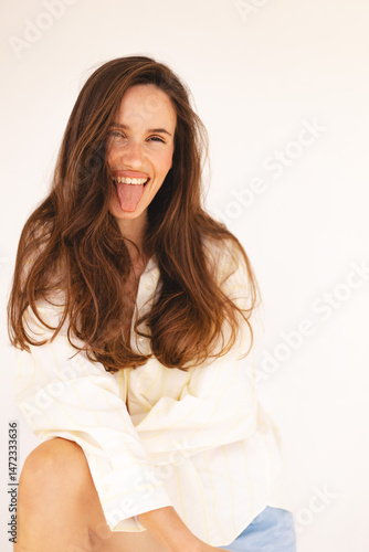 Portrait of a playful and cheerful young woman with long brunette hair, wearing a white shirt, sticking out her tongue and smiling. Fun on white background. Humor, spontaneity, happy, and expressive.