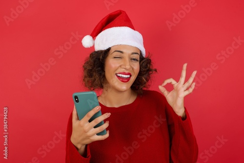 Portrait of a pretty happy Caucasian woman wearing Christmas hat holding smartphone and making ok sign. Approval and technology concept