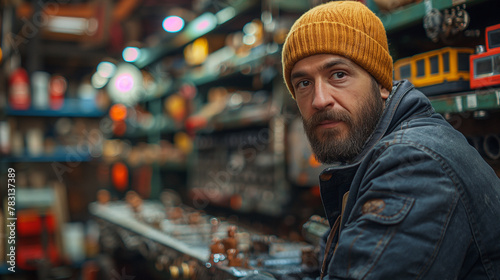 portrait of a professional carpenter in his workshop. handsome carpenter in goggles standing near table and equipment