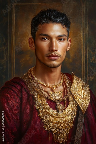 portrait, figure, attire, regal, ornate, man, jewellery, tradition, culture, art, beauty, imperial, majestic, showcase, gallery, masterpiece, ornamented, ancient, crimson, display, formally, stature, ruler, ethnic, majesty, allure, royals, realism, scepter, canvas, gold, history, power, artwork, fashion, heritage, costume, detail, design, aesthetic, craftsmanship, ornament, elegance, artist, symbol, flow, expression, dignity, clothing
