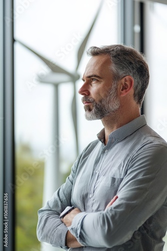 Portrait of a renewable energy consultant discussing wind energy projects in a professional setting