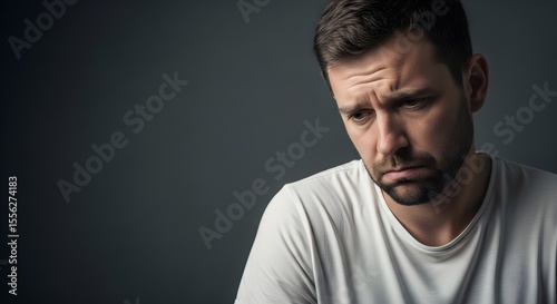 man, portrait, face, sad, worried, concerned, expression, emotion, feeling, depression, anxiety, stress, unhappy, melancholy, thoughtful, serious, contemplation, despair, grief, pain, suffering, mental health, alone, isolated, studio, dark, background, grey, white, shirt, beard, hair, eye, looking down, worry, human, adult, male, person, closeup, head shot, facial, grieved, sorrowful, downcast, pensive