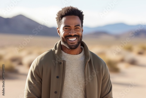 Portrait of a satisfied afro-american man in his 40s wearing a cozy sweater over backdrop of desert dunes