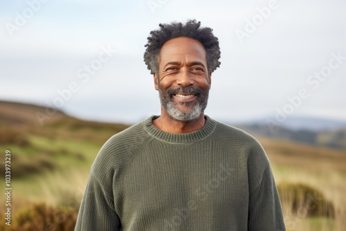Portrait of a satisfied afro-american man in his 50s wearing a cozy sweater while standing against serene dune landscape background