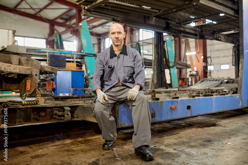 man, auto, mechanic, garage, car, workshop, portrait, machine, tool, equipment, industrial, fix, caucasian, male, sitting, repair, wear, workplace, maintenance, manual, profession, labor, uniform, glove, work, create, building, machinery, serious, metal, men at work, person, manufacturing, check, 1, job, occupation, service, bald