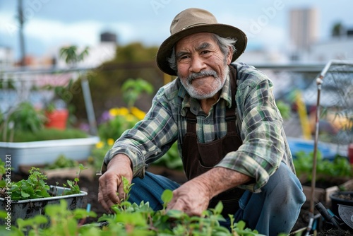 Portrait of a senior man smiling while gardening outdoors. Wearing a hat and apron, he tends to plants in a small urban garden. Concept of active retirement, healthy lifestyle, sustainable living and