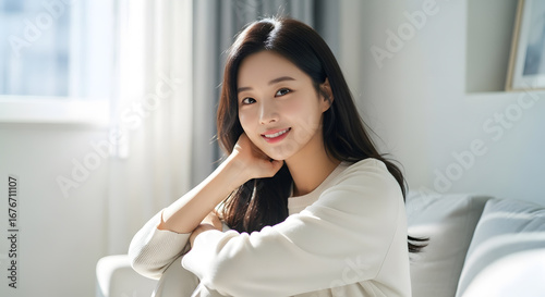 relaxing, woman, home, sofa, lifestyle, asian, korean, well-being, calm, comfortable, living room, peaceful, serene, couch, cosy, happy, smiling, beautiful, young, mindfulness, contentment, indoor, weekend, morning, leisure, sitting, resting, natural light, sunny, bright, apartment, domestic life, happiness, person, female, individual, portrait, quiet, break, interior, daylight, authentic, carefree, satisfied, rest, enjoying