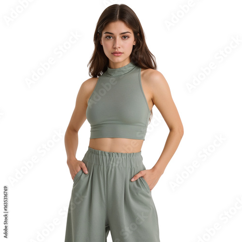 Portrait of a serene young woman in stylish activewear on isolated transparent ambiance