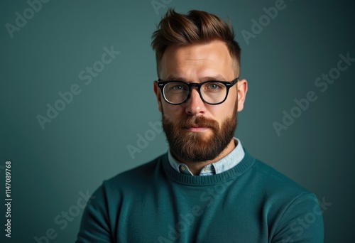 Portrait of a serious, bearded man with glasses, wearing a teal sweater against a muted green background.