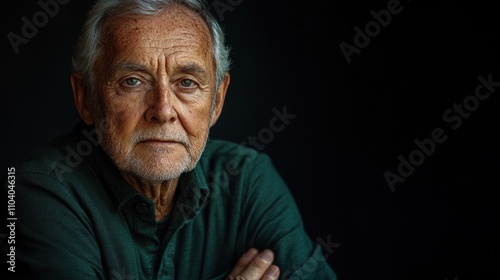 man, senior, elderly, old, person, male, face, portrait, serious, expression, arm, crossed, dark, background, studio, lighting, grey, hair, wrinkle, skin, eye, gaze, pensive, thoughtful, mature, ageing, age, grandfather, father, adult, human, model, people, head, shoulder, closeup, emotion, feeling, mood, contemplative, wisdom, life events, life, intense, sombre, stern