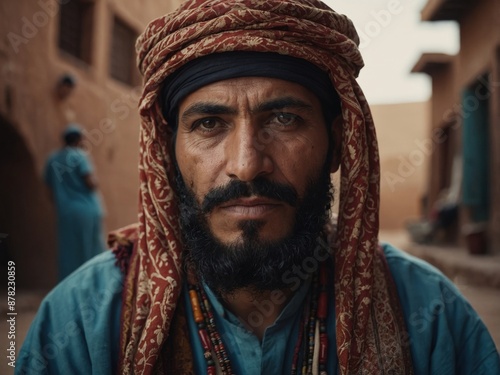 Portrait of a serious man wearing a traditional headscarf and cultural attire, standing in a desert town with a thoughtful expression.