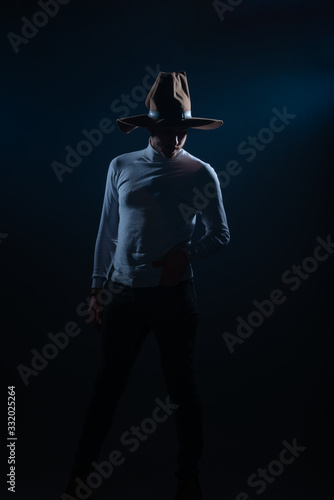 Portrait of a sexy young man with cowboy hat posing in a studio on high contrast and dark background