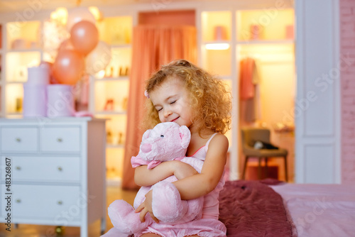 Portrait of a small curly blonde with a stuffed toy in the bedroom. A girl hugs a pink bear.