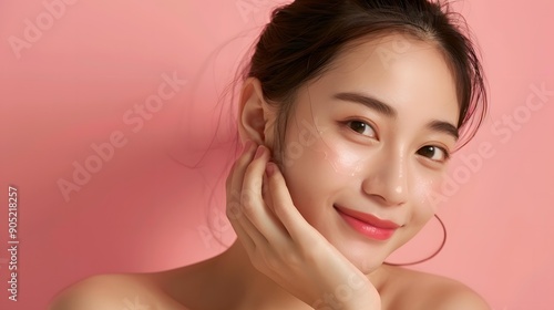 woman, asian, portrait, skin, face, smile, beautiful, model, beauty, girl, happy, fashion, make-up, eye, hair, pink, background, healthy, glow, natural, youth, attractive, gorgeous, radiant, confident, expression, female, 1, person