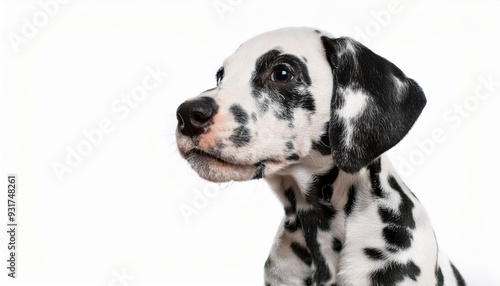 笑顔のダルメシアンの子犬のポートレート(Portrait of a smiling Dalmatian puppy on white background)