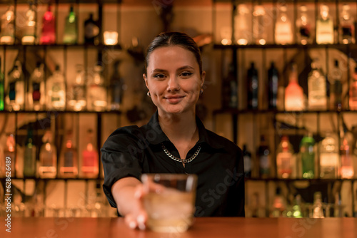 portrait of a smiling girl bartender who puts a cocktail with ice on the bar and serves it to the client